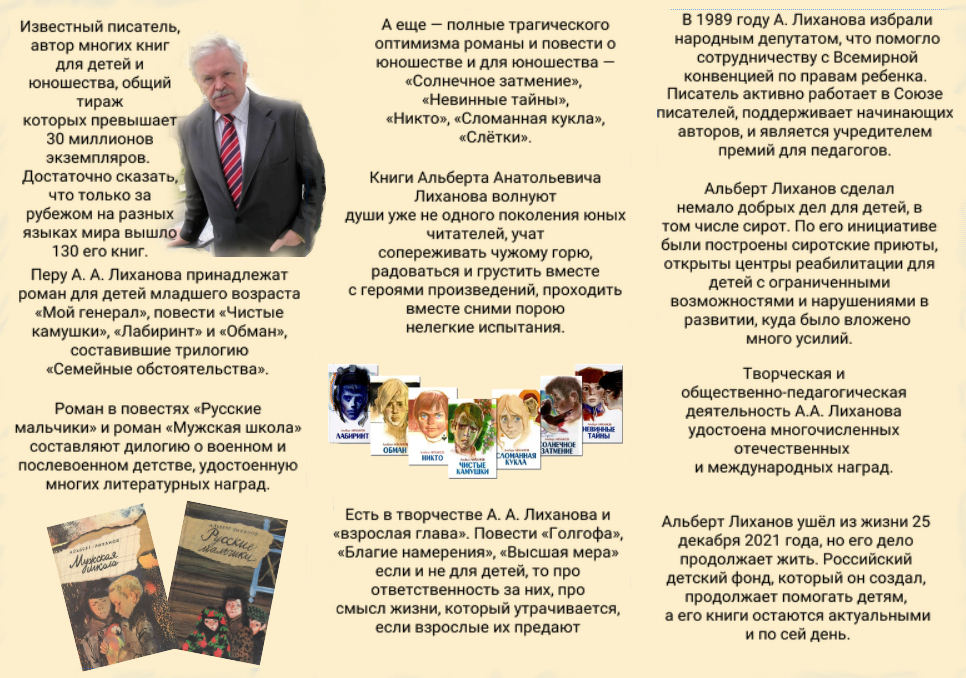 Писатель, общественный деятель, педагог и просто человек с огромным сердцем, Лиханов оставил после себя не только книги, но и целый мир, где дети чувствуют себя защищёнными.