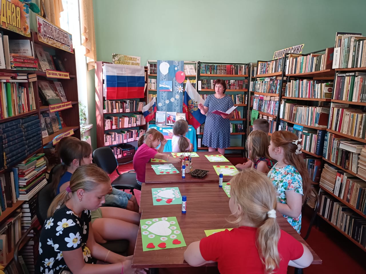 Затем участники мероприятия изготовили поделку из бумаги в цветовой гамме величественного флага России — бело–сине–красных тонах. С помощью цветной бумаги, клея и ножниц, ребята изготавливали аппликацию: флаги в форме сердца. В библиотеке к мероприятию был оформлен красочный тематический стенд.