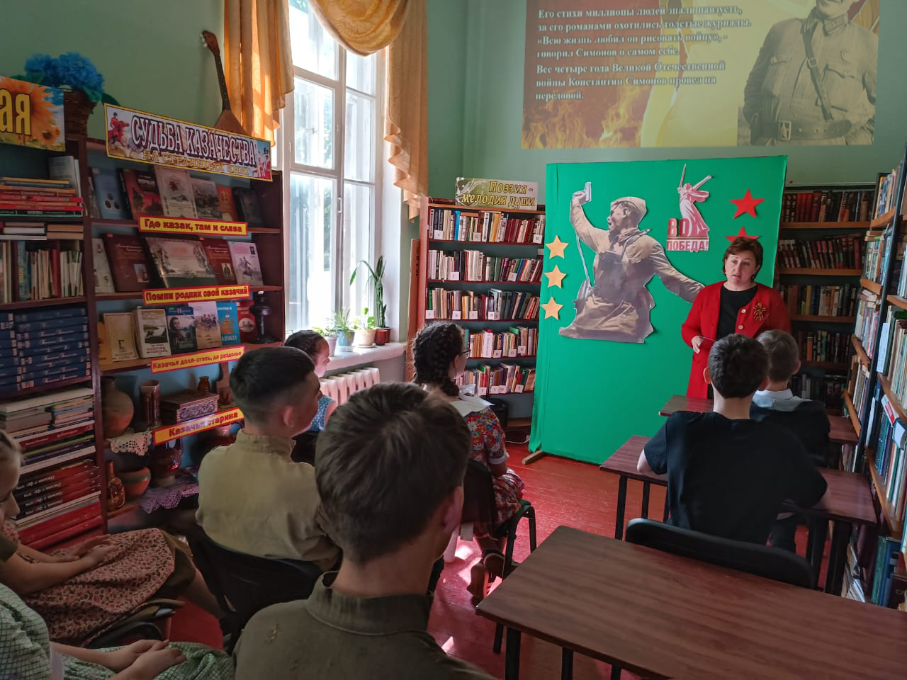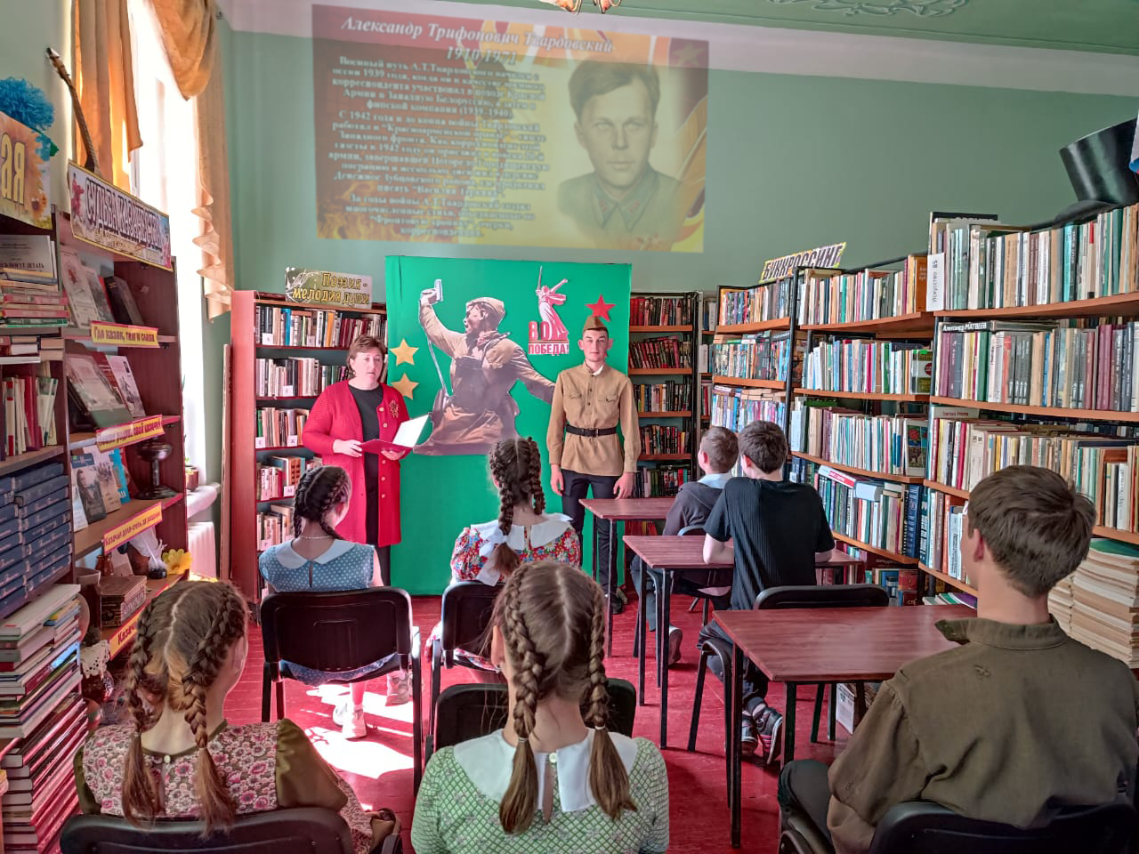 Из рассказа библиотекаря ребята узнали о судьбе поэтов —блестящей плеяды талантливых литераторов фронтового поколения, среди которых Василий Лебедев-Кумач, Константин Симонов, Александр Твардовский, Алексей Сурков, Давид Самойлов, Булат Окуджава, Юлия Друнина. Война была для них, вчерашних школьников и студентов, досрочным началом «взрослой» жизни. В эти свинцовые годы сформировался их талант, определился характер творчества. Почти все они прошли войну солдатами и офицерами переднего края. На мероприятии звучали их стихи. Литературно-поэтический микс прошел в атмосфере глубокого уважения и преклонения перед подвигом советских солдат. Вспоминая произведения поэтов-фронтовиков, участники встретились лицом к лицу с историей, почувствовали боль потерь и гордость за мужество соотечественников.