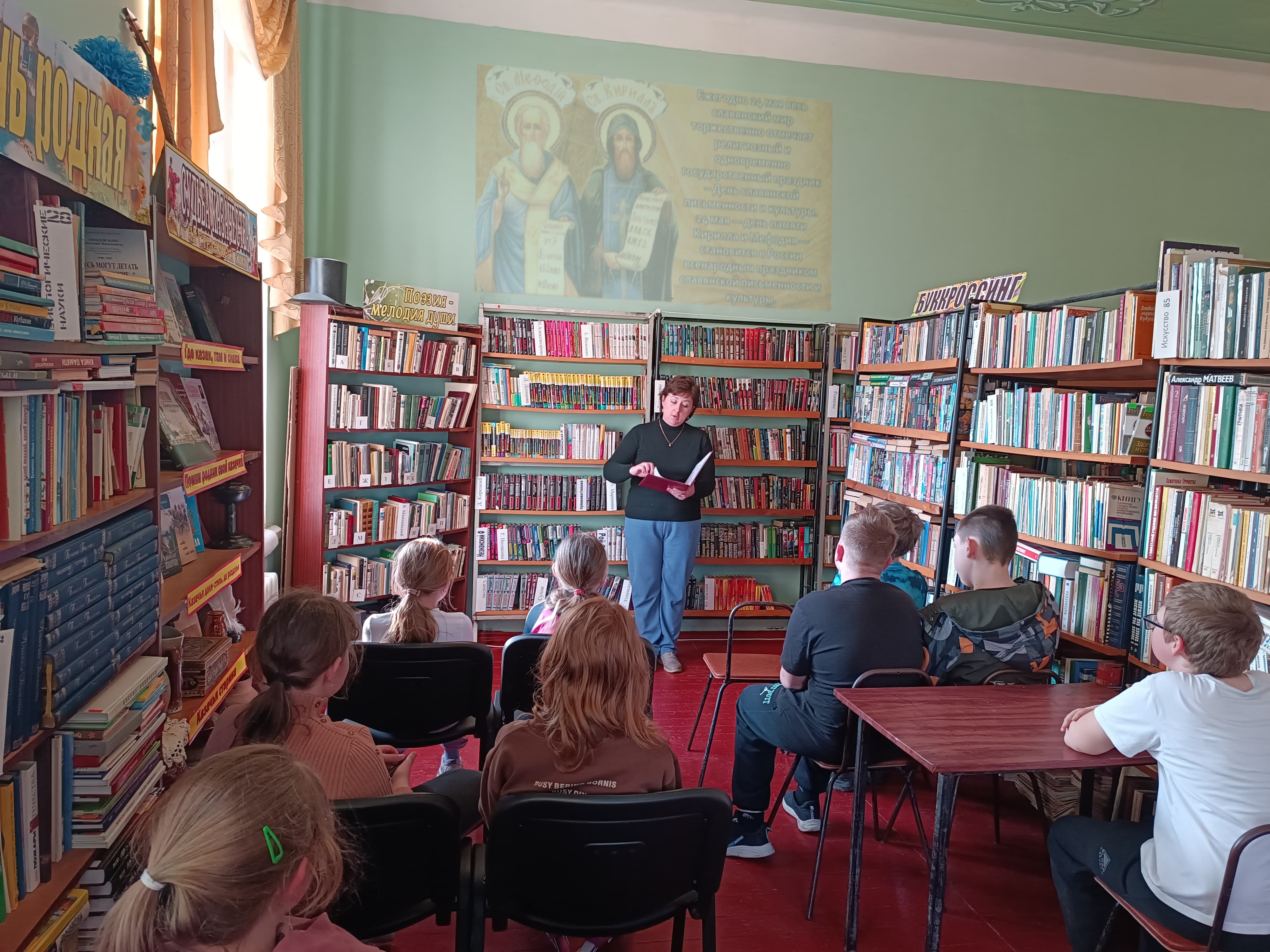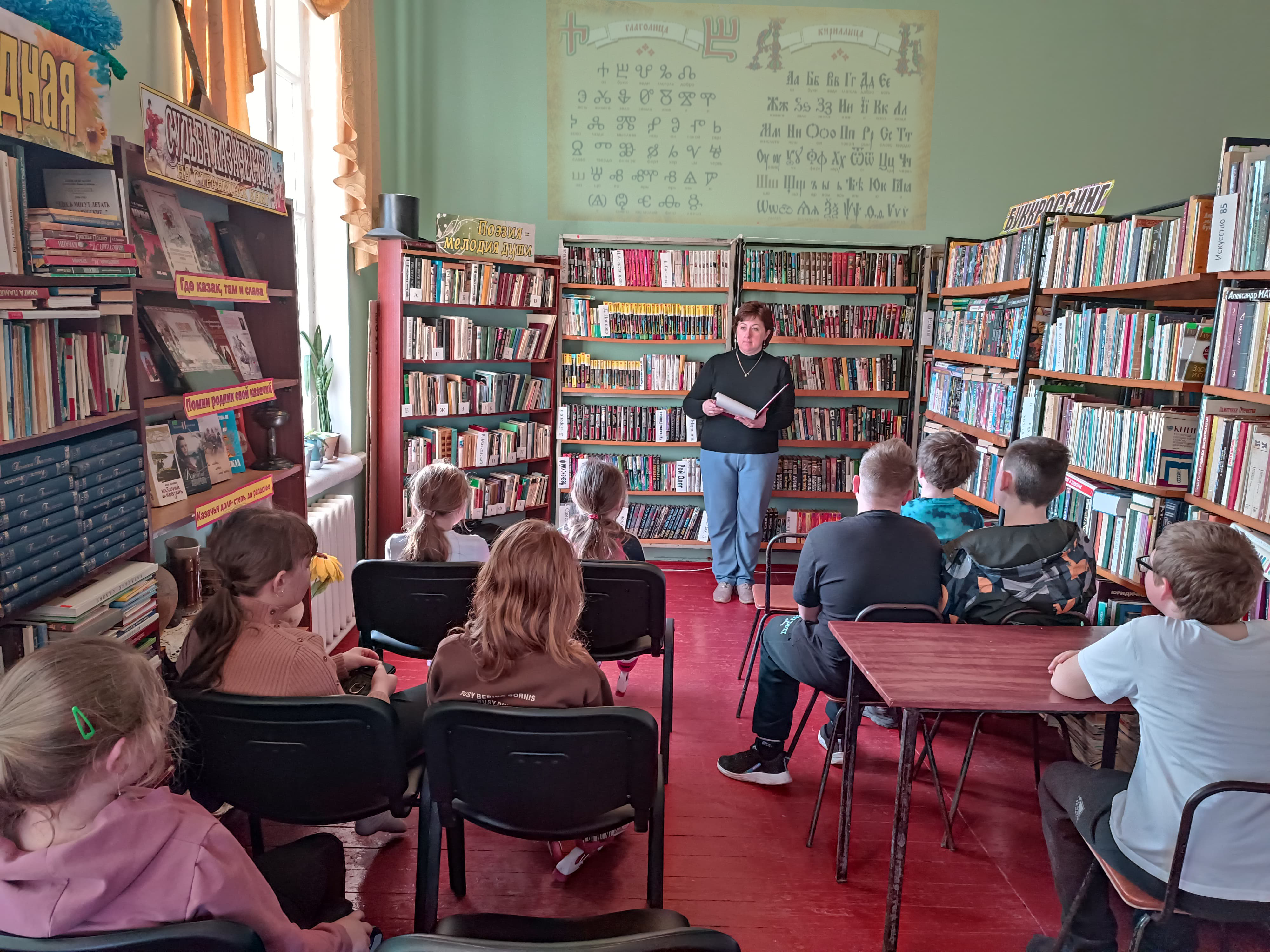 Библиотекарь познакомила ребят с историей появления русской письменности, рассказала об истоках славянской азбуки, уделила внимание равноапостольным братьям Кириллу и Мефодию, ведь они не только создали первый алфавит и стали символом духовного подвига, но и заложили основы для появления письменности и литературы в целом. Ребята узнали также о их учениках, продолживших дело просветителей, разработавших и создавших Кириллицу - азбуку, ставшую основой для русского языка.