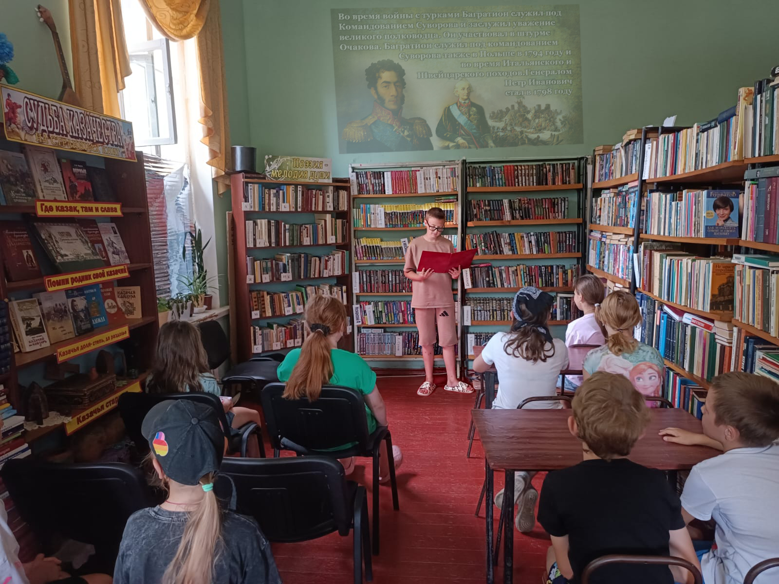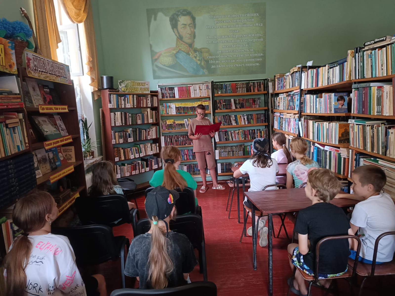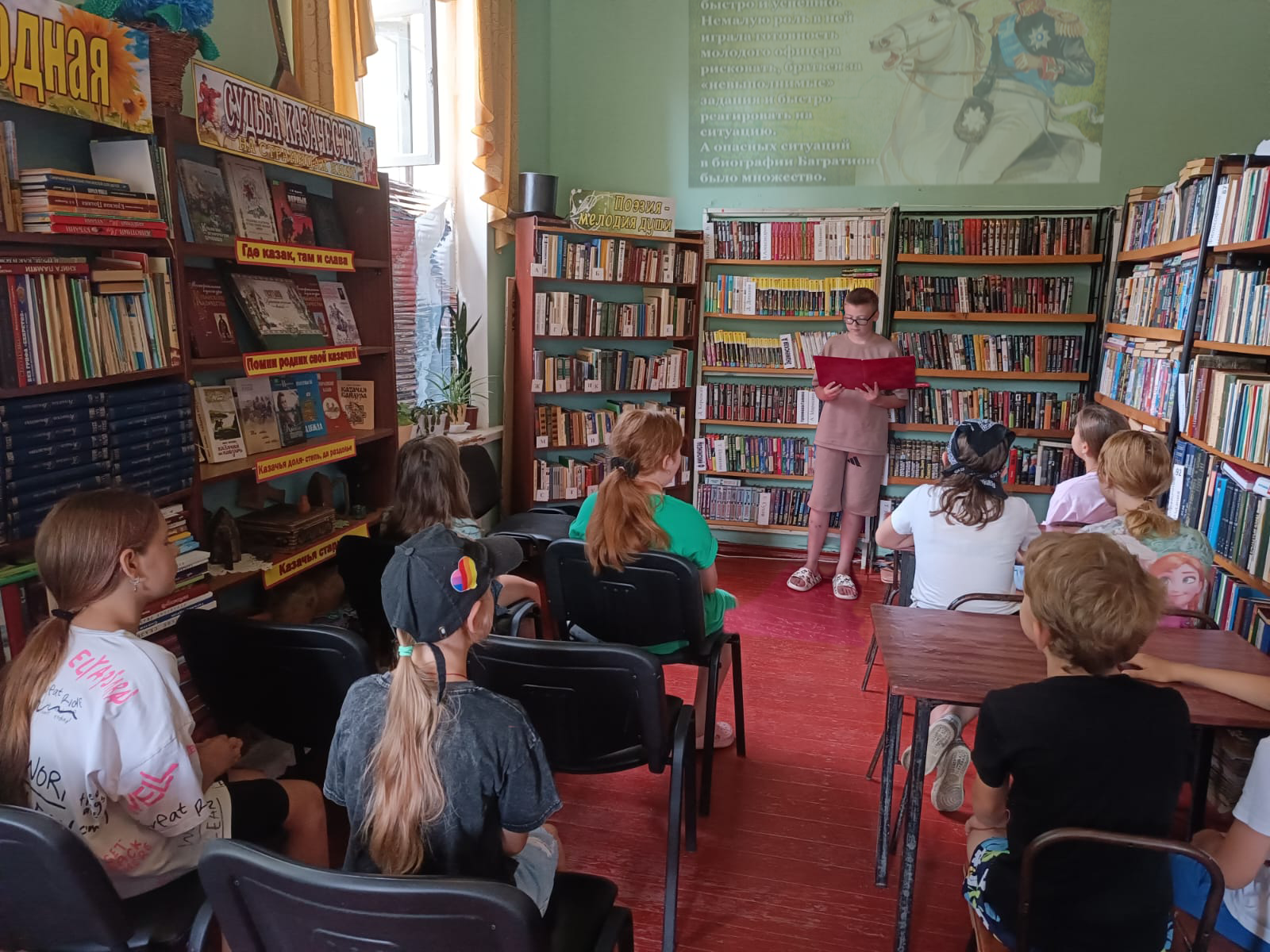 К 260-летию со дня рождения русского военачальника П.И.Багратиона, в рамках краевого марафона «Вместе мы крепкая сила», в Туркинской библиотеке,филиал №1 волонтером Саркисян Игорем был подготовлен вечер-портрет «Герой народной войны: Петр Багратион». Юные пользователи познакомились с биографией полководца, героя Отечественной войны 1812 г, узнали о его сражениях и подвигах, о том, что боевая деятельность Багратиона насчитывала 20 походов и войн, 150 сражений и боев. Это мероприятие позволило вспомнить о героическом прошлом нашей страны и отдать дань уважения выдающемуся военачальнику Петру Ивановичу Багратиону, как и всем офицерам 1812 года, которых отличало какое-то особенное чувство долга, чести, гордости, беззаветной храбрости и, конечно же, безграничной любви к своему Отечеству.