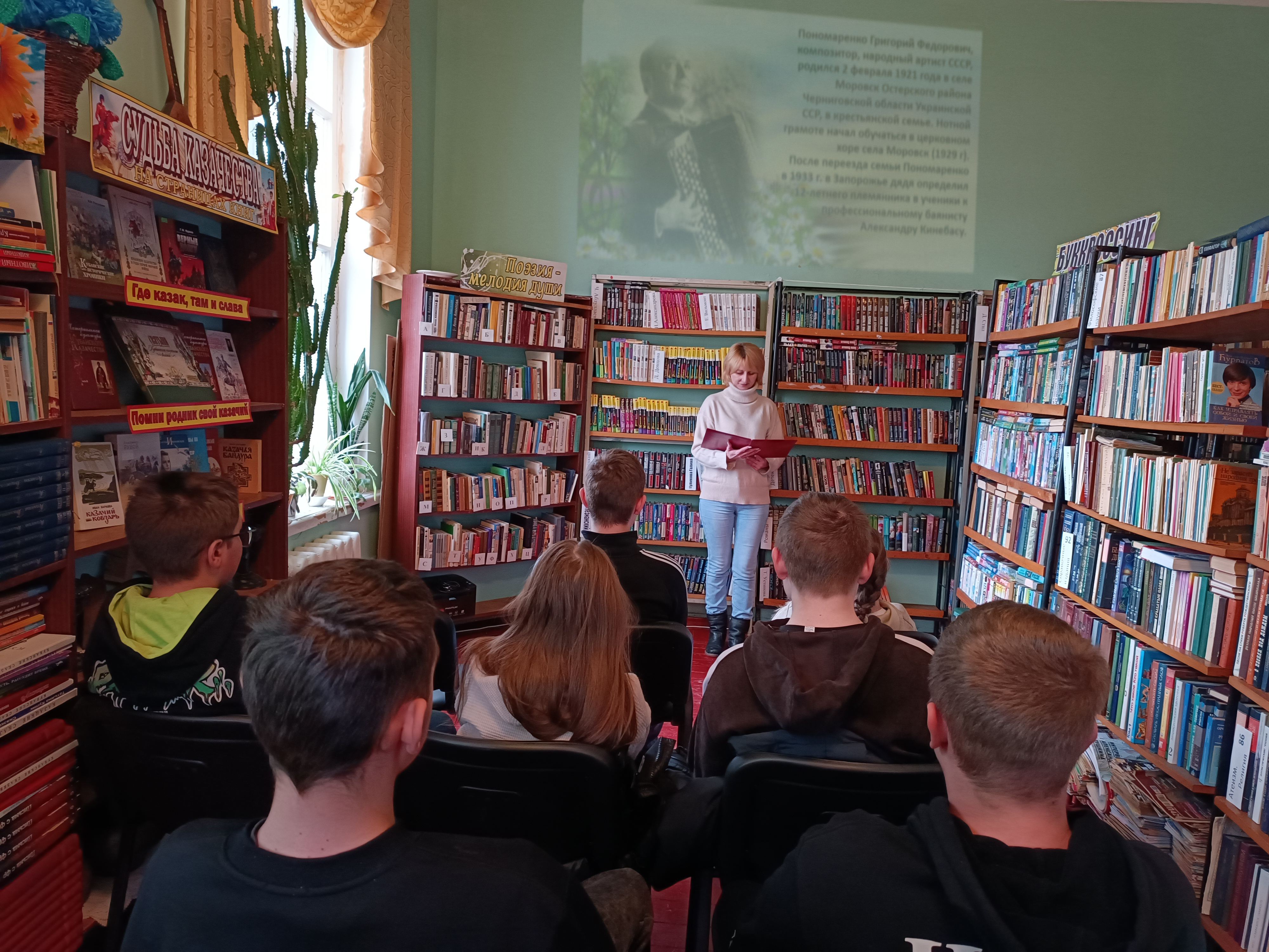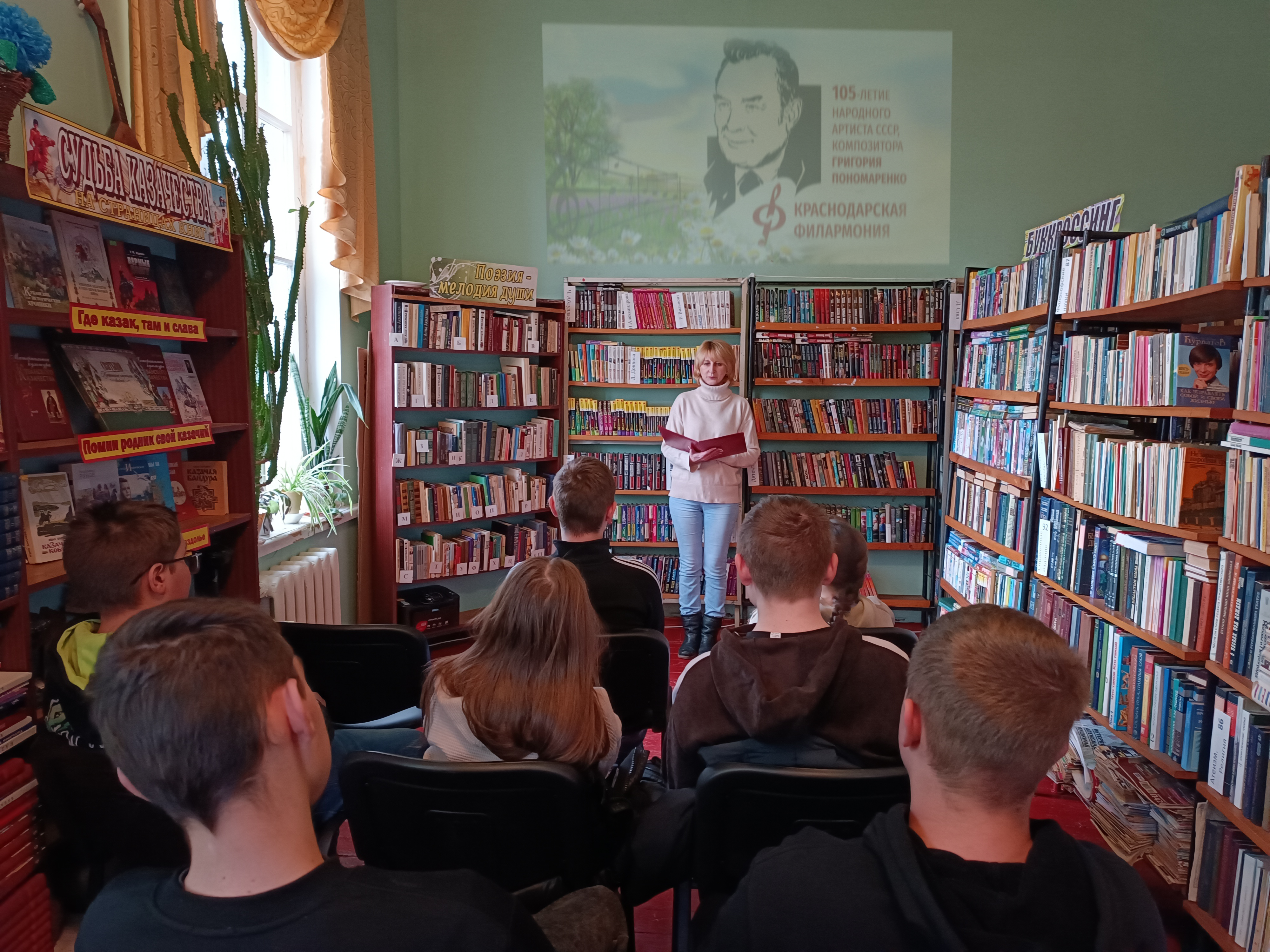 Туркинская библиотека, филиал №1, не могла обойти стороной эту знаменательную дату., в рамках краеведческого проекта «И края в мире нет дороже, где довелось родиться нам…» 19 февраля для молодежи состоялся литературно-музыкальный час под названием «Летит над Кубанью крылатая песня». Мероприятие было посвящено 105-летию со дня рождения выдающегося советского и российского композитора, чье творчество неразрывно связано с Кубанью.